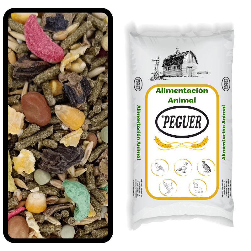 Compuesto por: Pienso especial para conejos y cobayas en gránulo, maiz, maíz en copos, avena, trigo, cebada cervecera, bolas de maíz extrusionado, garrofa, panitricolor, guisantes y habines.
