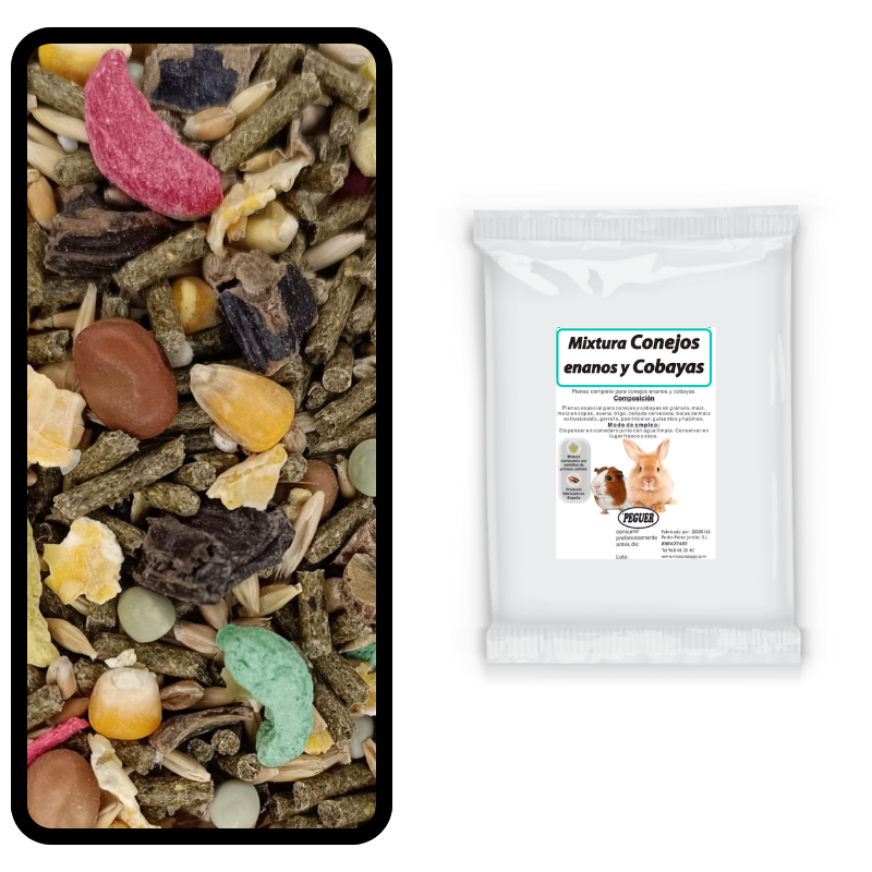 Compuesto por: Pienso especial para conejos y cobayas en gránulo, maiz, maíz en copos, avena, trigo, cebada cervecera, bolas de maíz extrusionado, garrofa, panitricolor, guisantes y habines.