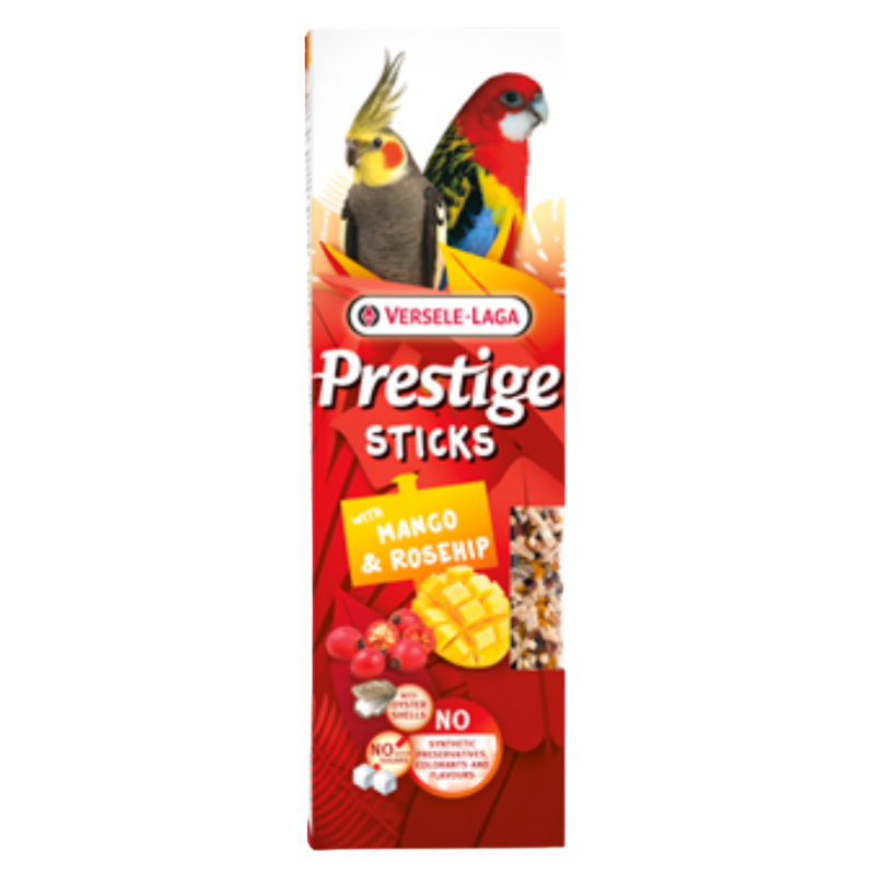 Los Versele Laga Prestige Sticks con Mango y Escaramujo son un alimento complementario ideal para ninfas y agapornis. Cada palito combina frutas naturales como el mango y el escaramujo con semillas seleccionadas, proporcionando un snack sabroso y equilibrado que promueve la salud y el bienestar de tus aves.