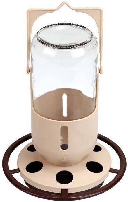 Bebedero con botella de crital extraible de 1 lt aprox, ideal para colgar en pajareras y guardar bien el agua dentro del recipiente.