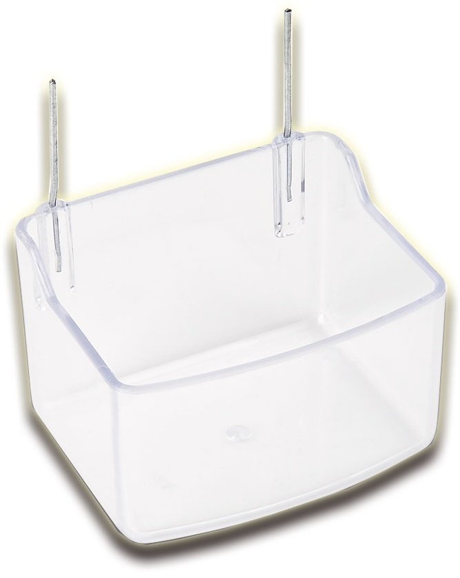 Comedero loro con gancho de alambre para colgar en la jaula.