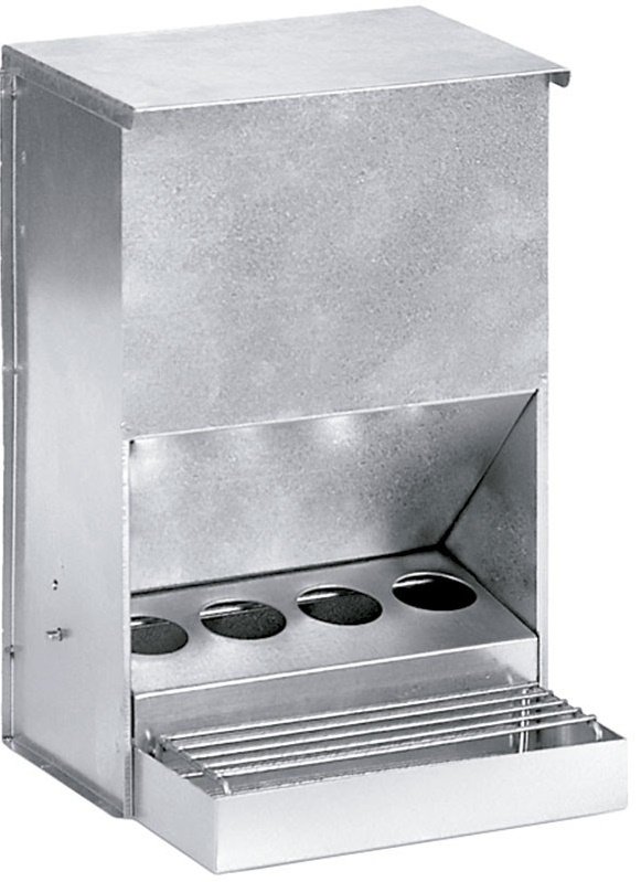 Comedero tolva metálica galvanizada, de 4 huecos, para colocar en pajareras, con apoyo para el pájaro y hueco para los desperdicios de la comida.