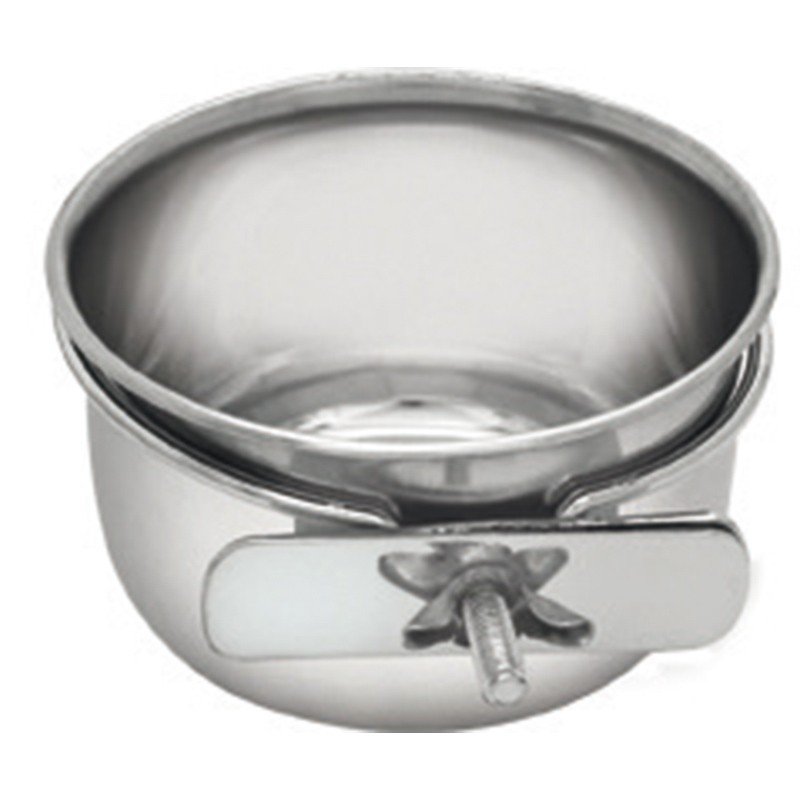 Comedero en acero inoxidable que incluye una brida y una palomilla metálica para su instalación en panel rígido o de malla adaptable para cualquier jaula. Plato extraíble para facilitar el relleno del pienso y con el borde redondeado para evitar cortes en las patas o en la boca del animal.