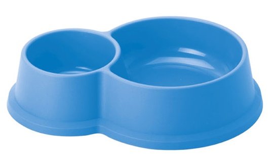 Comedero de plástico con doble hueco para comida y agua.