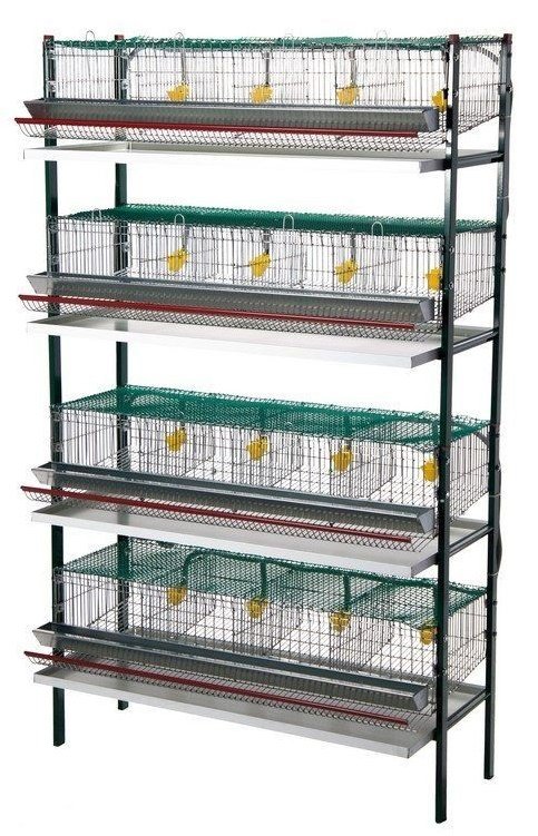 Batería de jaulas para perdices de 4 departamentos, fabricada en alambre electrosoldado y techo en plástico para evitar golpes al asustarse, el sistema de bebederos a baja presión y comedero en canal, la bandeja es extraíble para una fácil limpieza y juego de patas para asegurar la estabilidad de la jaula. Posibilidad de ampliar verticalmente tantas jaulas como se requiera.