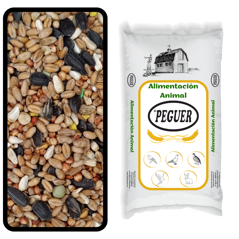 Trigo, sorgo rojo, alazor, pipas negras, guisantes, yeros, cañamón y corrector vitamínico.