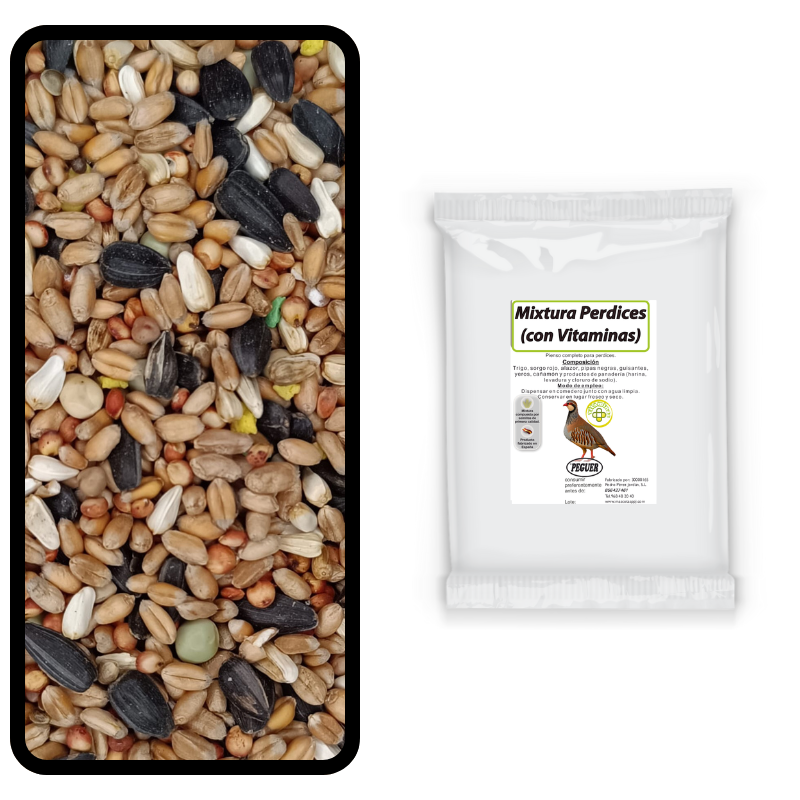 Trigo, sorgo rojo, alazor, pipas negras, guisantes, yeros, cañamón y corrector vitamínico.
