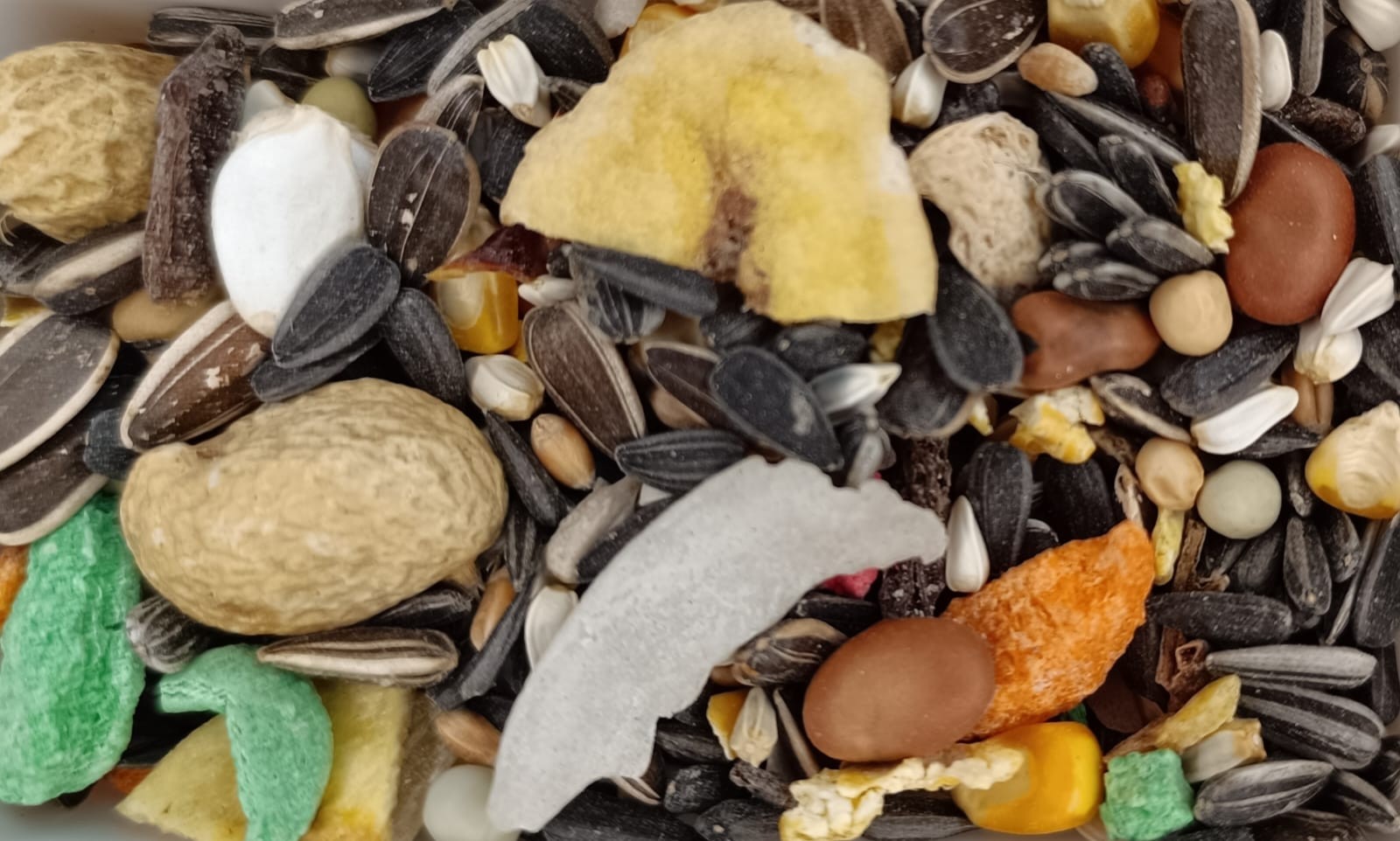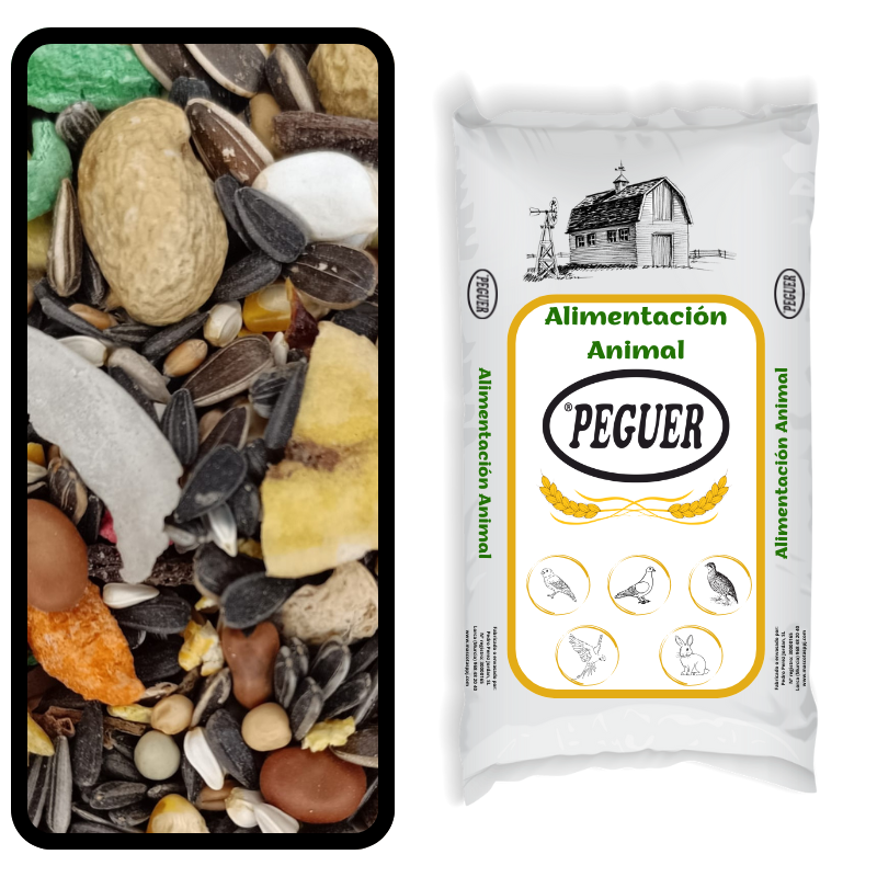 Pipa negra, pipa loro, maíz, sorgo rojo, cacahuetes, pipa húngara, trigo, maíz en copos, habines, alazor, guisantes, corrector vitamínico, pipa blanca, rollos de maíz inflado, plátano, pasas, pipa de calabaza, piña en dados, papaya en dados, coco seco y alforfón.
