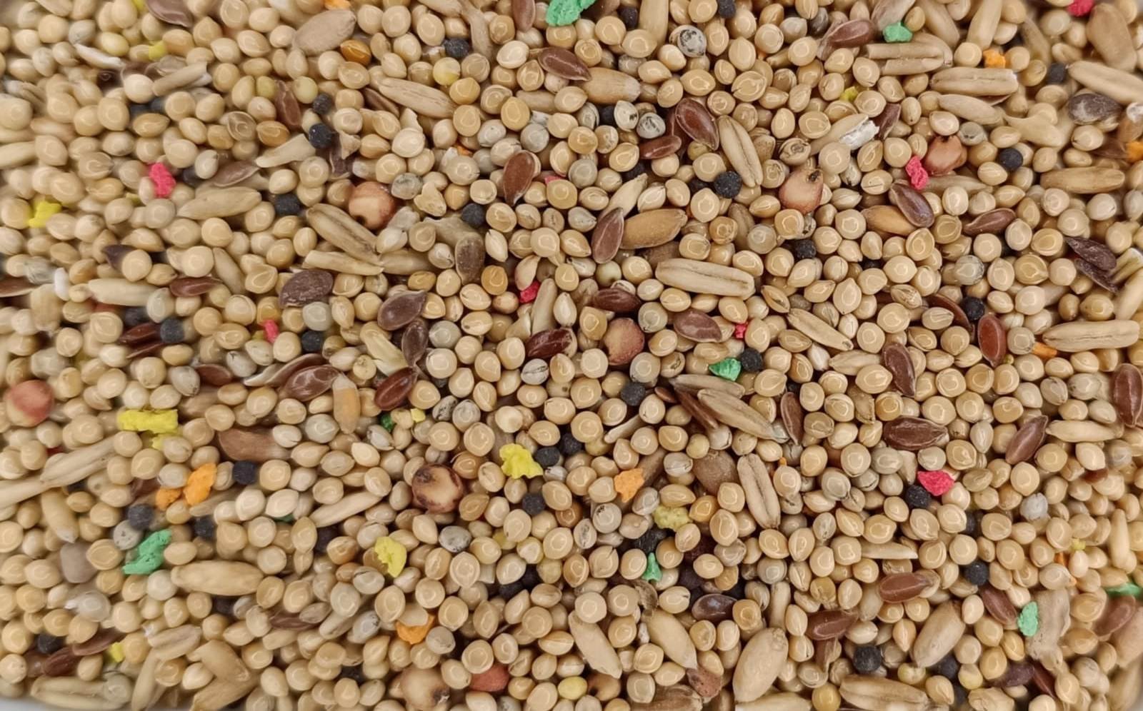 Mijo amarillo, avena pelada, corrector vitamínico, linaza y nabina.