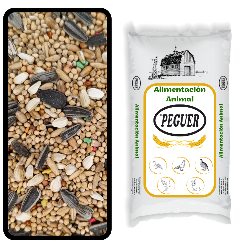 Mijo amarillo, pipa húngara, avena pelada, alazor, trigo, sorgo, pipa negra y corrector vitamínico.