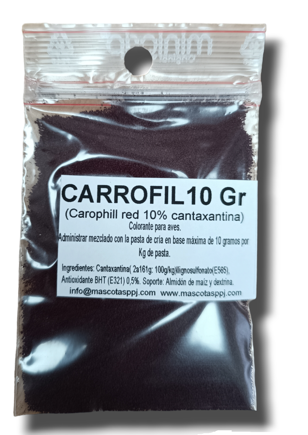 Mantiene e intensifica los colores rojos de las aves. Administrar durante los periodos de cria y muda de los pájaros.