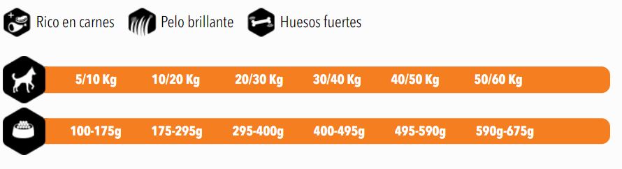 Composición: Proteína de carne deshidratada (40%), Cereales, Subproductos de origen vegetal (pulpa de remolacha mín. 2%), aceites y grasas (grasa de ave mín. 7%), Sustancias minerales.
