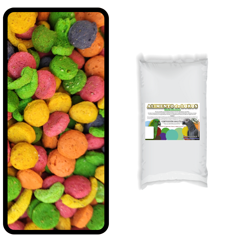 Alimento completo y equilibrado extrusionado para loros en forma redondeada y platanitos.