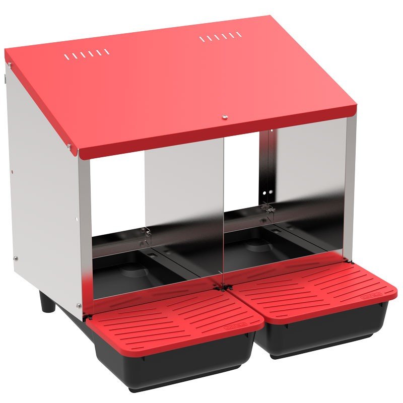 Nuevo ponedero para gallinas de 2 departamentos con una nueva cubeta de plástico de fácil extracción para una mejor limpieza y desinfección. Esta nueva cubeta aparte de estar desarrollada para su fácil mantenimiento, cuenta con unas patas para poder ponerla en cualquier superficie sin necesidad de atornillarla a la pared, por lo que facilitamos su movilidad por todo el corral asegurando su perfecto funcionamiento. El depósito de cada cubeta ha sido desarrollado para almacenar de 8 a 12 huevos y la tapa se mantiene elevada para facilitar la recogida de huevos con una mano.