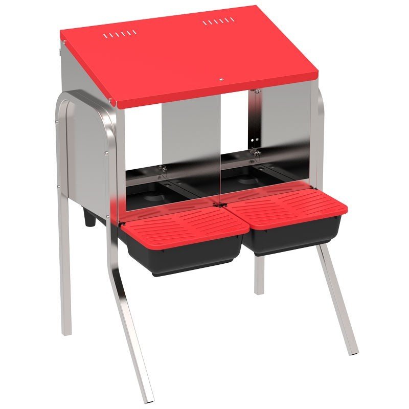 Ponedero con patas diseñado para poner en cualquier parte del gallinero o corral, elevado del suelo y sin necesidad de ser fijado a la pared. Cuenta con una nueva cubeta que permite que cada departamento pueda ser manipulado de manera independiente desde el exterior, permitiendo extraer tanto la cubeta como la cubierta de chapa para facilitar la limpieza, mantenimiento y el acceso al interior. El depósito de cada cubeta ha sido desarrollado para almacenar de 8 a 12 huevos y la tapa se mantiene elevada para facilitar la cogida de huevos con una mano. El techo cuenta con unas aperturas para impedir condensaciones dentro del ponedero.