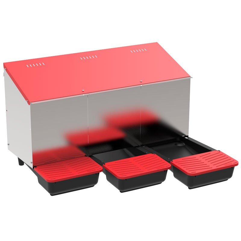 Nuevo ponedero para gallinas de 3 departamentos, desarrollado para facilitar la recogida de huevos desde el exterior del corral o gallinero (como se puede ver en el video). Su diseño permite que cada departamento pueda ser manipulado de manera independiente desde el exterior, permitiendo extraer tanto la cubeta como la cubierta de chapa para facilitar la limpieza, mantenimiento y el acceso al interior. El depósito de cada cubeta ha sido desarrollado para almacenar de 8 a 12 huevos y la tapa se mantiene elevada para facilitar la cogida de huevos con una mano.