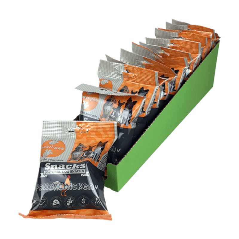 COMPOSICIÓNSnack de pollo 70% de carne fresca. Rico en pollo (min. 14%).
