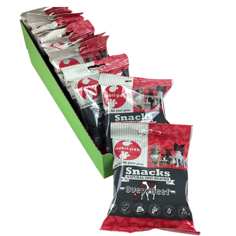 COMPOSICIÓNSnack de buey 70% de carne fresca. Rico en buey (min. 10%).La caja contiene 12 unidades.
