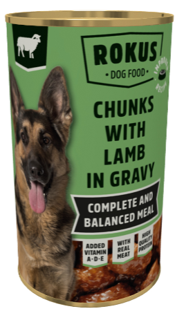 Trozos de carne de cordero envasado en latas con abrefácil, de alto contenido en proteinas, grasas y humedad.