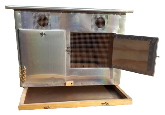 Cajonera para palomas de chapa con bandeja extraible, puerta y ventana lateral.